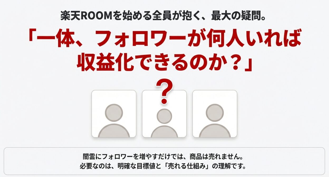 この記事では、楽天ROOMのフォロワー数はどの水準を目指すべきかを初心者にもわかりやすく解説します。さらに、フォロワーを効率的に増やす方法や、収益化の目安についても紹介します。