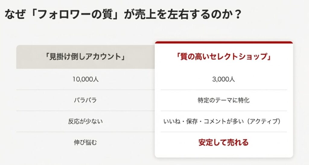 重要なのは、商品に関心を持つアクティブフォロワーです。いいねや保存、コメントなどの反応が多いフォロワーがいるほど投稿が広がりやすく、購入につながる可能性も高くなります。