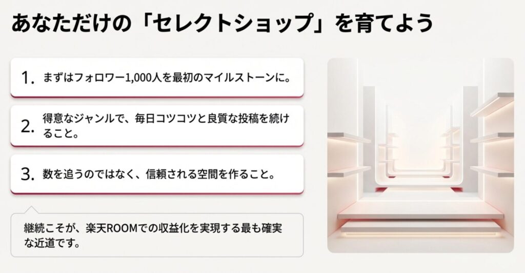 この記事では、楽天ROOMのフォロワー数はどの水準を目指すべきかについて解説しました。重要なポイントを振り返ると、楽天ROOMではフォロワー数によって活動のステージが大きく変わり、まずはフォロワー1000人が収益化の一つの目安になります。また、フォロワー数を増やすためには、毎日コツコツ投稿すること、売れている商品を紹介すること、そしてジャンルを統一して専門性を高めることが重要です。