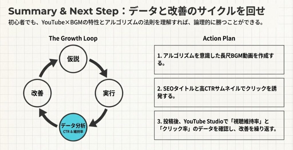 YouTubeで成果を出すためには、継続的に動画を投稿しながらデータを分析し、改善を繰り返すことが大切です。YouTube×BGMとYouTubeアルゴリズムの特徴を理解し、正しい再生数の伸ばし方を実践することがチャンネル成長への近道といえるでしょう。