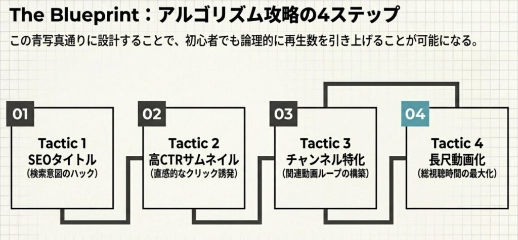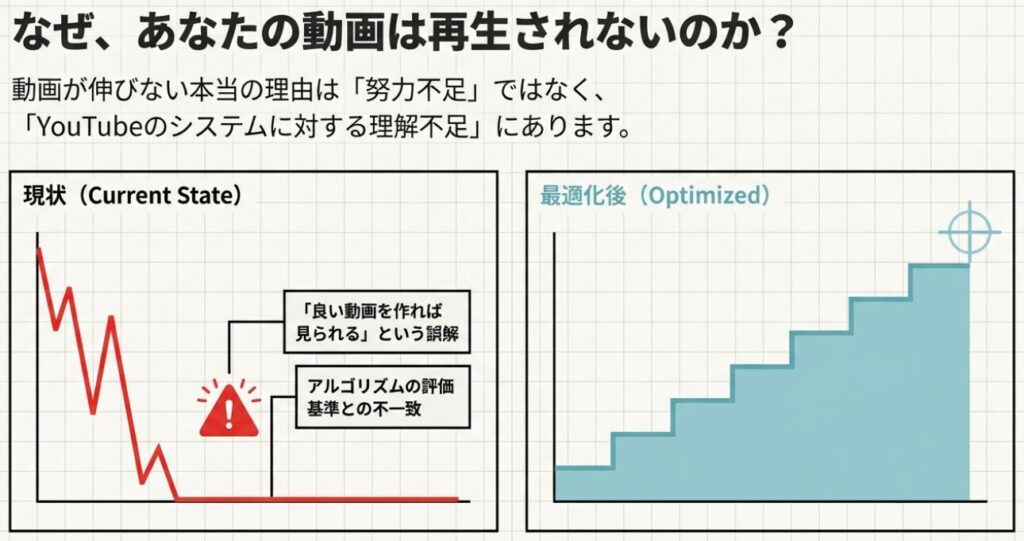 特に重要なのは、視聴時間・視聴維持率・クリック率の3つです。これらの指標を改善することが、再生数を伸ばすための基本戦略になります。