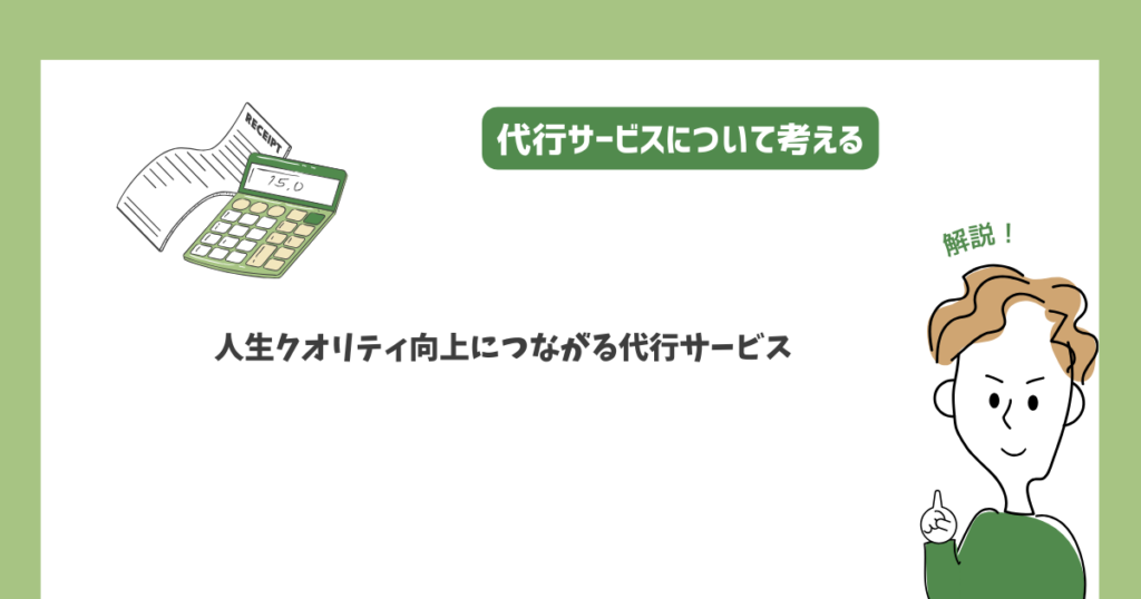 そこで鍵になるのが、活用すべき代行サービスです。記帳・経理代行や資料作成代行によって思考停止作業を手放せば、高付加価値な判断や創造に集中でき、年収アップに直結します。さらに、家事代行や食事・健康系代行を取り入れることで、心身の負担が軽減され、人生クオリティ向上にもつながります。