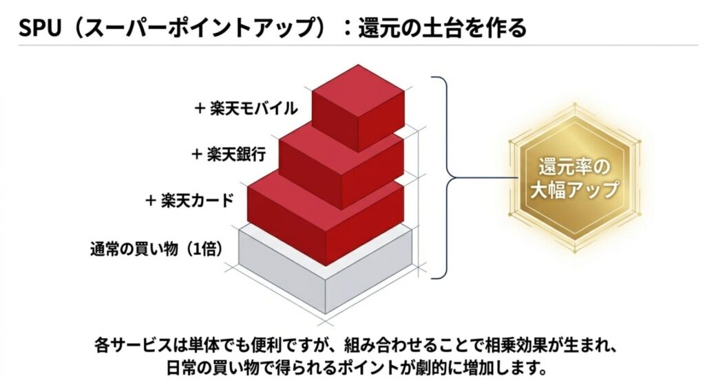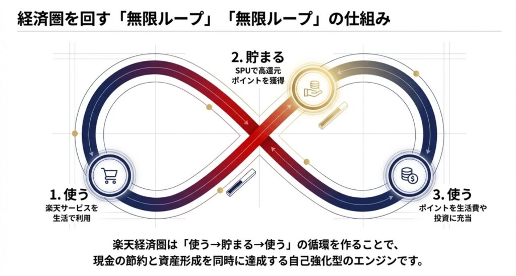 楽天経済圏の最大の特徴は、サービスを使うほどポイント還元率が上がる点です。なぜなら、SPU(スーパーポイントアッププログラム)によって利用状況に応じて倍率が加算される仕組みだからです。例えば、楽天カードで支払い、楽天モバイルを契約するだけでも還元率が上がり、日常の買い物で得られるポイントが増えます。さらに貯まったポイントは楽天市場での買い物だけでなく、投資や公共料金の支払いにも使えるため、現金の節約にもつながります。つまり、楽天経済圏は「使う→貯まる→使う」の循環を作ることで、お得さを最大化できる仕組みです。