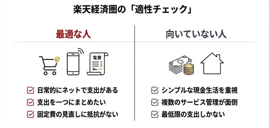 一方で、楽天経済圏が必ずしも全ての人に向いているわけではありません。なぜなら、複数のサービスを管理する手間が発生するため、シンプルな生活を重視する人には負担になる可能性があるからです。例えば、ポイント倍率やキャンペーン条件を把握し続けることを面倒に感じる場合、十分にメリットを活かしきれないことがあります。また、最低限の支出で生活している人にとっては、そもそもポイントの恩恵が小さいケースもあります。そのため、効率よりも手軽さを重視する人は、無理に楽天経済圏にこだわらない選択も重要です。
